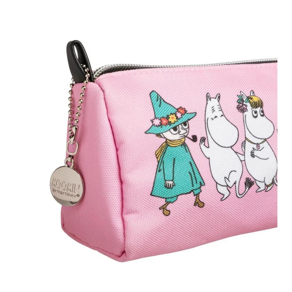 Růžový penál na zip Ruttu Moomin Friends. Měkký penál má širokou základnu, vnitřek s podšívkou a trojúhelníkové bočnice. Elegantní a prostorný penál na pera nebo jiné drobnosti. Penál s rozměry 19 x 8,5 x 6,5 cm má kovový odznak Moomin by Martinex a lze ho použit i jako kosmetickou taštičku na řasenku nebo make-up. Zapínání je na kovový zip a materiál je odolný, špínu a vodu odpuzující polyester. Do penálu se vejde pár per, pravítko a guma nebo případně klíče nebo drobné poklady