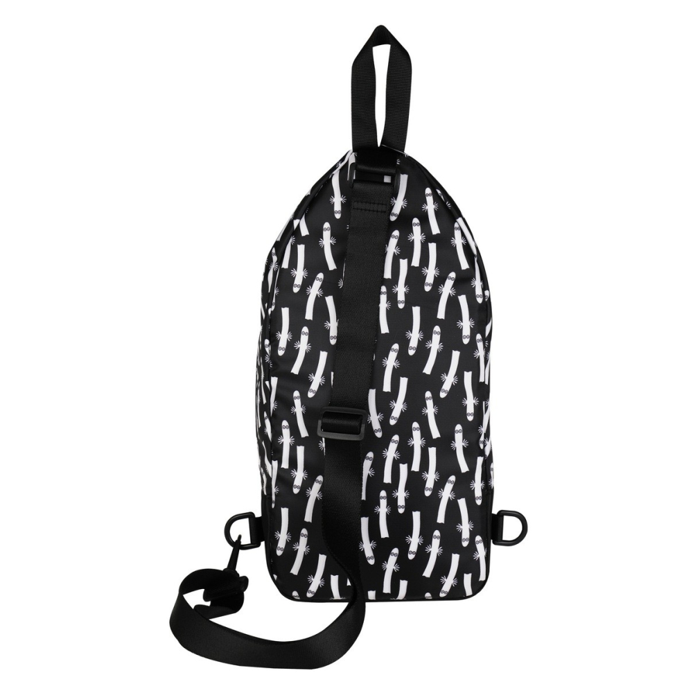 Hurá na výlet! S crossbody batohem Moomin Hattifatteners si budete každou cestu užívat dvakrát tolik. Tento menší krásný batůžek přes rameno je vyrobený z odolného 100% polyesteru, nemusíte se tedy bát příliš krátké výdrže. Obsahuje přední kapsu, do níž můžete uložit třeba klíče nebo malou peněženku. Černá barva je velmi praktická a potisk postaviček z oblíbeného seriálu Mumínci neskutečně roztomilý. Hattifatteners, tajemná stvoření připomínající bílou ponožku, která se velmi zajímají o počasí, už se moc těší, až budou na cestách vašimi parťáky.