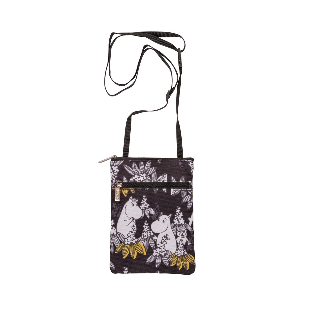 Malá taška obdélníkového tvaru s okouzlujícím vzorem Moomin Marnie na černém základě. Taška je praktické velikosti se zapínáním na zip, má dlouhý nastavitelný ramenní popruh (135 cm) a přední kapsu na zip. Skvělá taštička na cesty, do obchodu nebo dokonce na večírky: kam si můžete vzít s sebou na cestu mobil, doklady a další drobné nezbytnosti. Taštička je kvalitním výrobkem s originálním designem z Moomin kolekce.