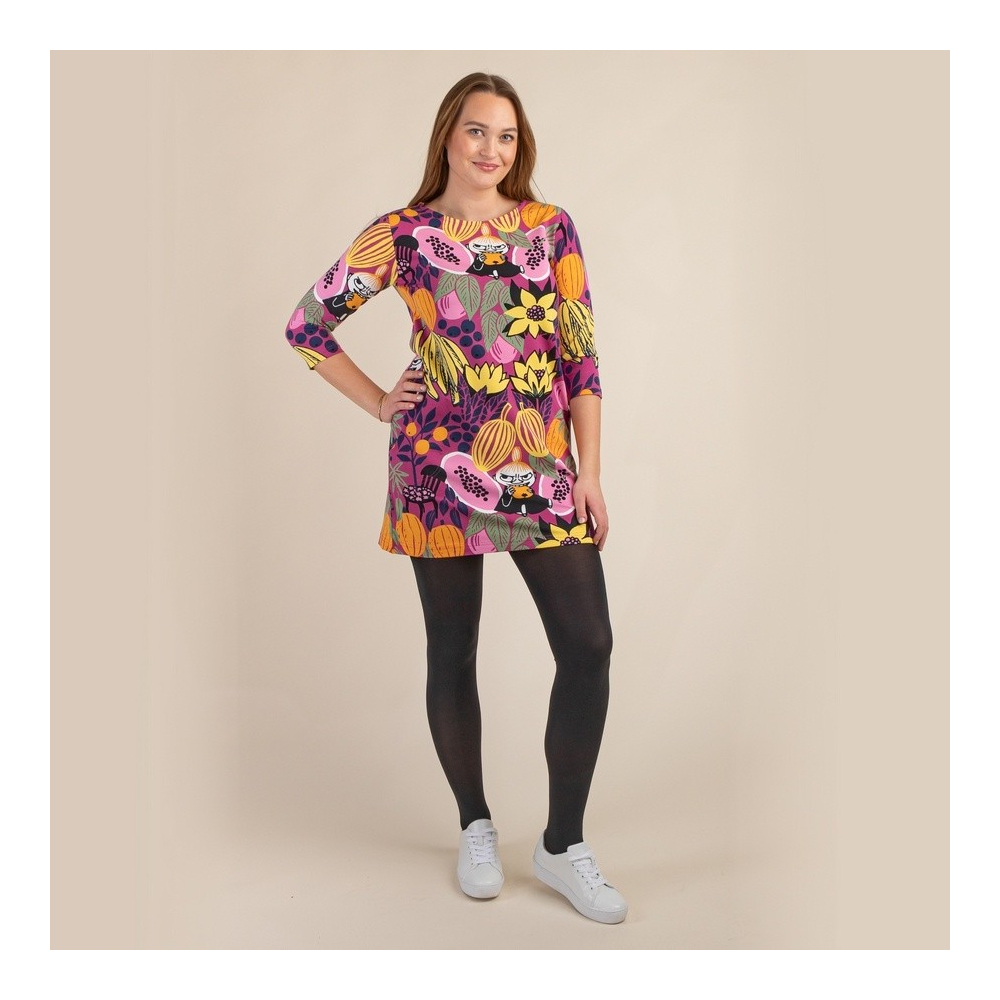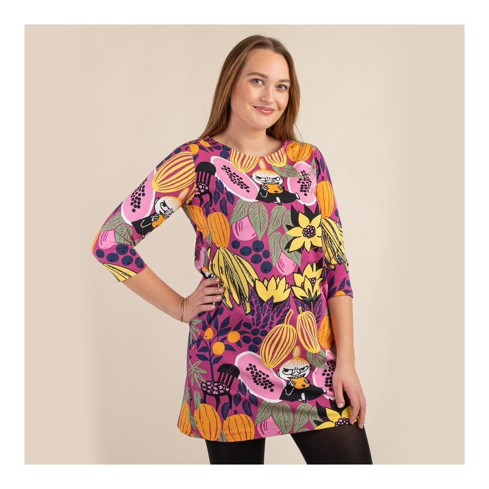 Dámská tunika Papaya z kolekce Moomin hýří barvami, má 3/4 rukávy a originální potisk, na němž malá Mia (Little My) ochutnává papáju. Malá Mia se s chutí pustila do ovoce a náležitě si jej vychutnává. Doufejme, že nějaké ovoce zbyde, aby mohla mumínkům připravit lahodnou šťávu nebo džem!