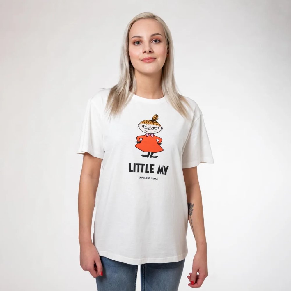 Bílé unisex tričko s krátkými rukávy. Na hrudi je potisk s Little My a anglický popisek: „Small but fierce.“ Little My je ohnivá a nebojácná malá holčička. Má ostrý jazyk a zlomyslného ducha, ale vždy je laskavá a upřímná.