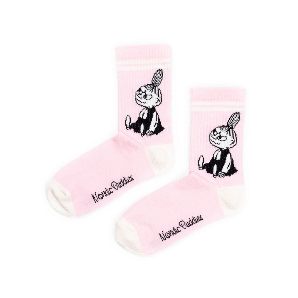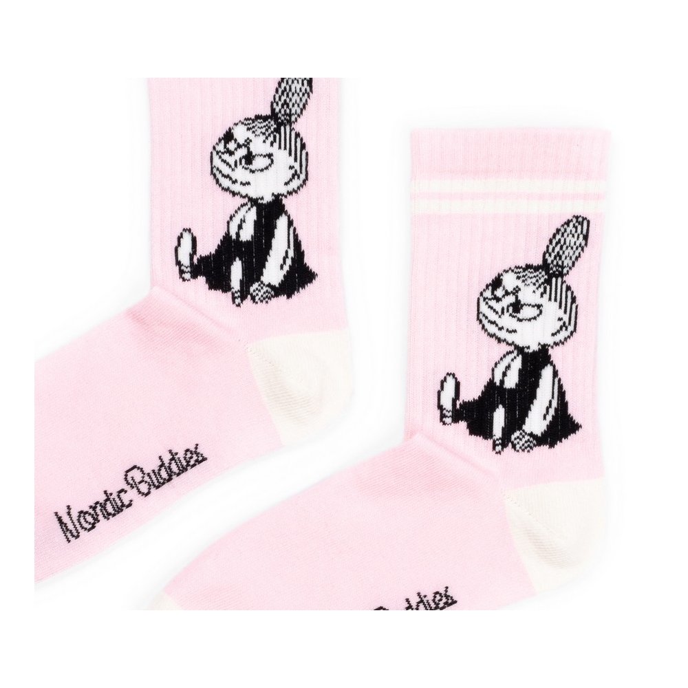 Růžové retro ponožky s motivem Little My a bílým proužkem u horního lemu jsou energickým a veselým doplňkem, který vám rozjasní den. Zesílené chodidlo zajišťuje pohodlí a odolnost, zatímco žebrovaný profil kolem kotníku drží ponožku na svém místě. Tyto ponožky s Little My jsou ideální pro ty, kdo hledají kvalitní bavlněné ponožky s výrazným designem a hravou náladou.