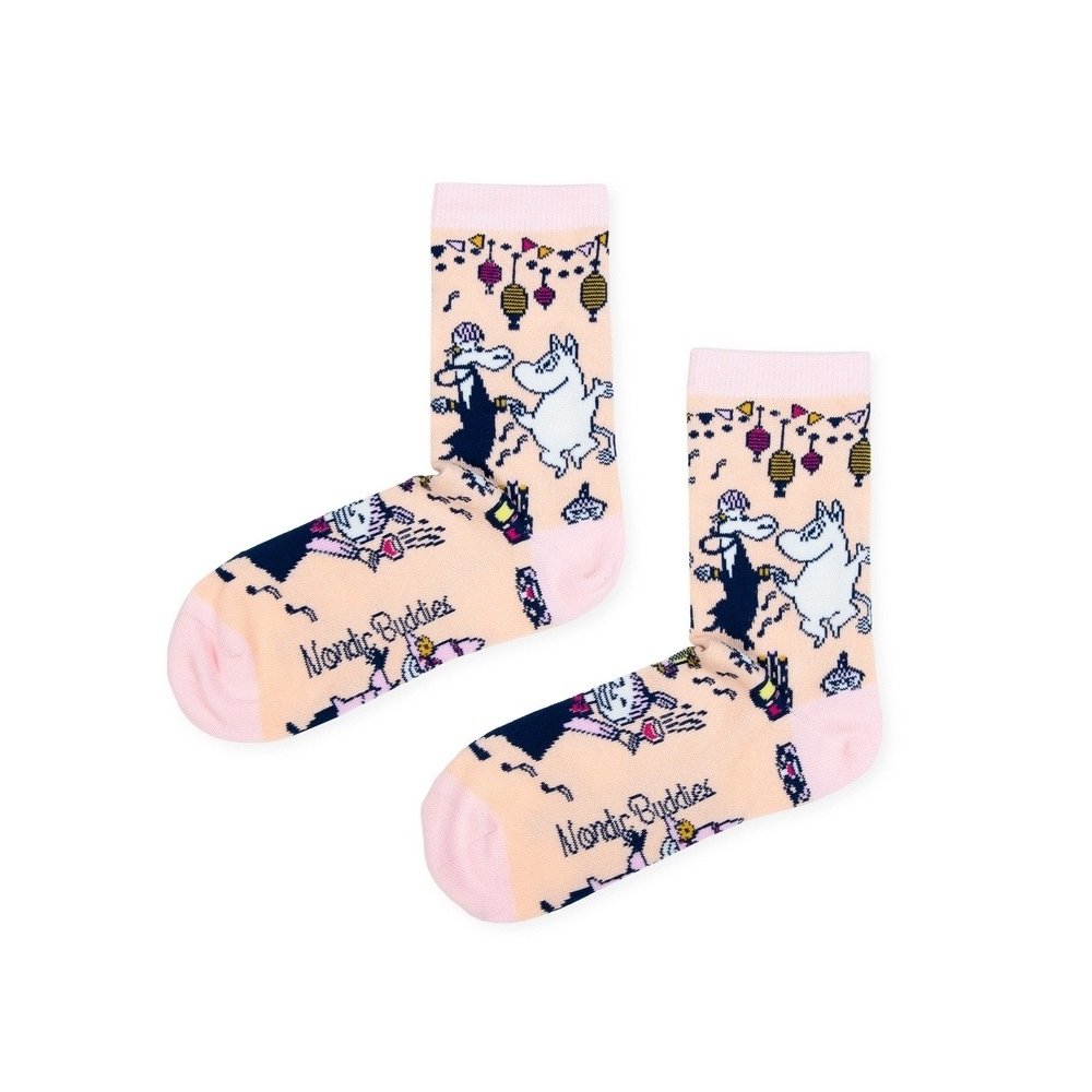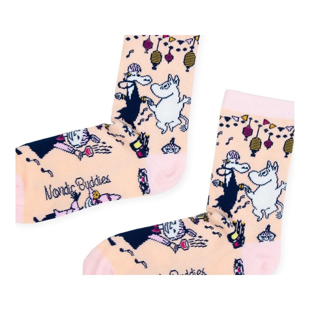 Broskvově béžové ponožky s motivem Moomins Party vás zavedou přímo do veselého mumínkovského tance! Všichni slaví, tančí a baví se, a vy můžete být u toho – alespoň symbolicky. Díky pohodlnému bavlněnému úpletu se hodí na každodenní nošení i jako originální dárek. Velikost 36–42 padne většině a jemný pastelový odstín se snadno kombinuje s ostatním oblečením.